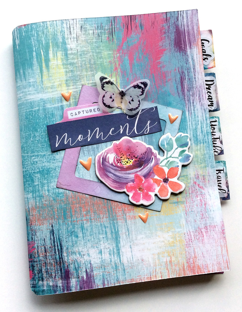 For this notebook I used the gorgeous Abstract paper from the TSK, the moments cutout from the PLK and the chipboard sticker from the BPK. The ephemera frame and butterfly and tab as well as the heart stickers are from the TSK.